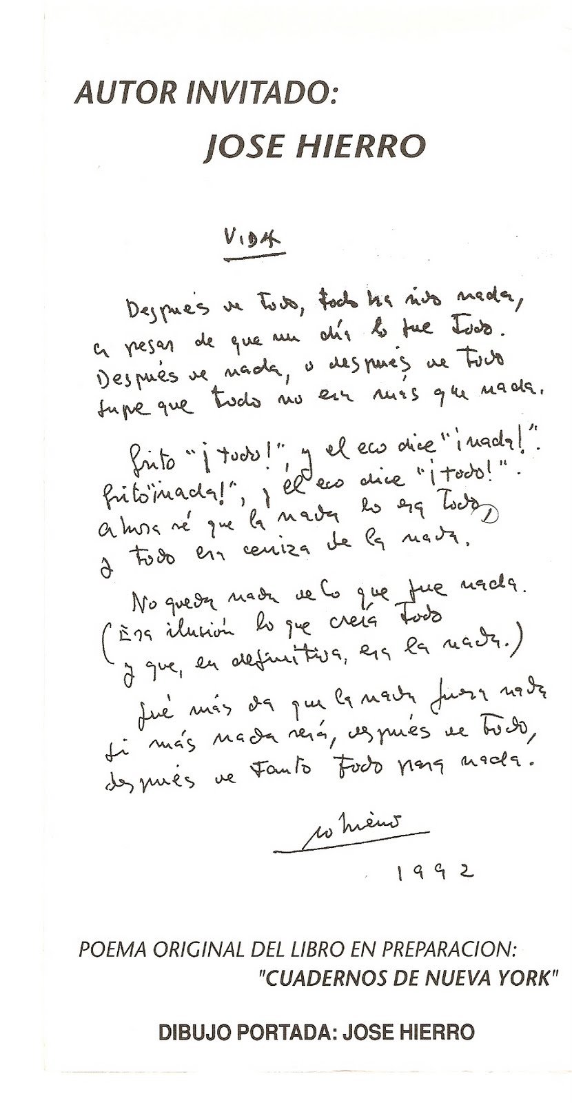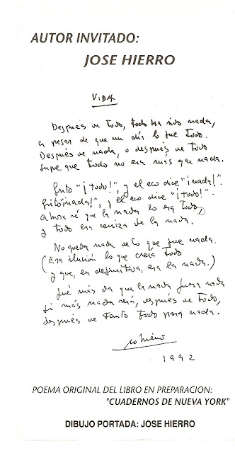 Importante para él, como un sacramento, o como un estigma. Vivió siempre dentro de la poesía, vivió rodeado de poetas, vivió multiplicando la poesía a su alrededor porque sabe que el universo total no es un lugar sino una manera de vivir en todos los actos y gentes donde la poesía tiene derecho a llegar y quedarse. La poesía fue siempre para él una pasión y un oficio. Cualquier otra cosa que haga, no le librará nunca de su condición natural y única de poeta.